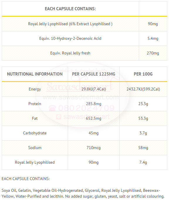 - สำหรับประสิทธิภาพหรือคุณภาพของ Royal Jelly นั้น ให้ดูที่ปริมาณสุทธิของ Royal Jelly หรือ สารสำคัญ ซึ่งก็คือ 10-HDA และส่วนประกอบอื่นๆ (ปริมาณ 10-HDA และส่วนประกอบของแต่ละยี่ห้อ ไม่เท่ากัน)